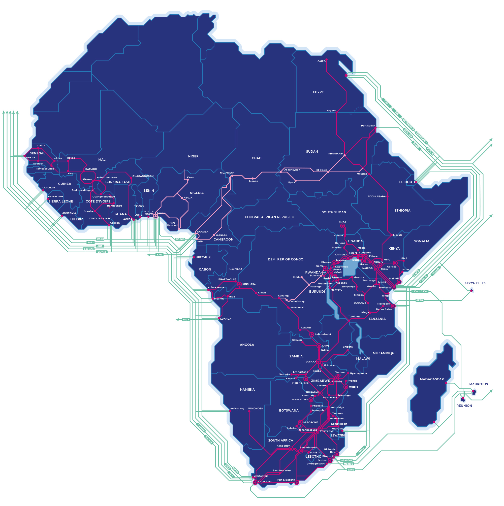 Depuis la mise en place de notre première fibre en 2009, notre réseau transfrontalier à haut débit s’est développé pour atteindre plus de 110,000 km de fibre. Il s’agit du plus grand réseau indépendant du continent, offrant une connectivité à tous les principaux systèmes de câbles sous-marins qui relient l’Afrique au reste du monde.